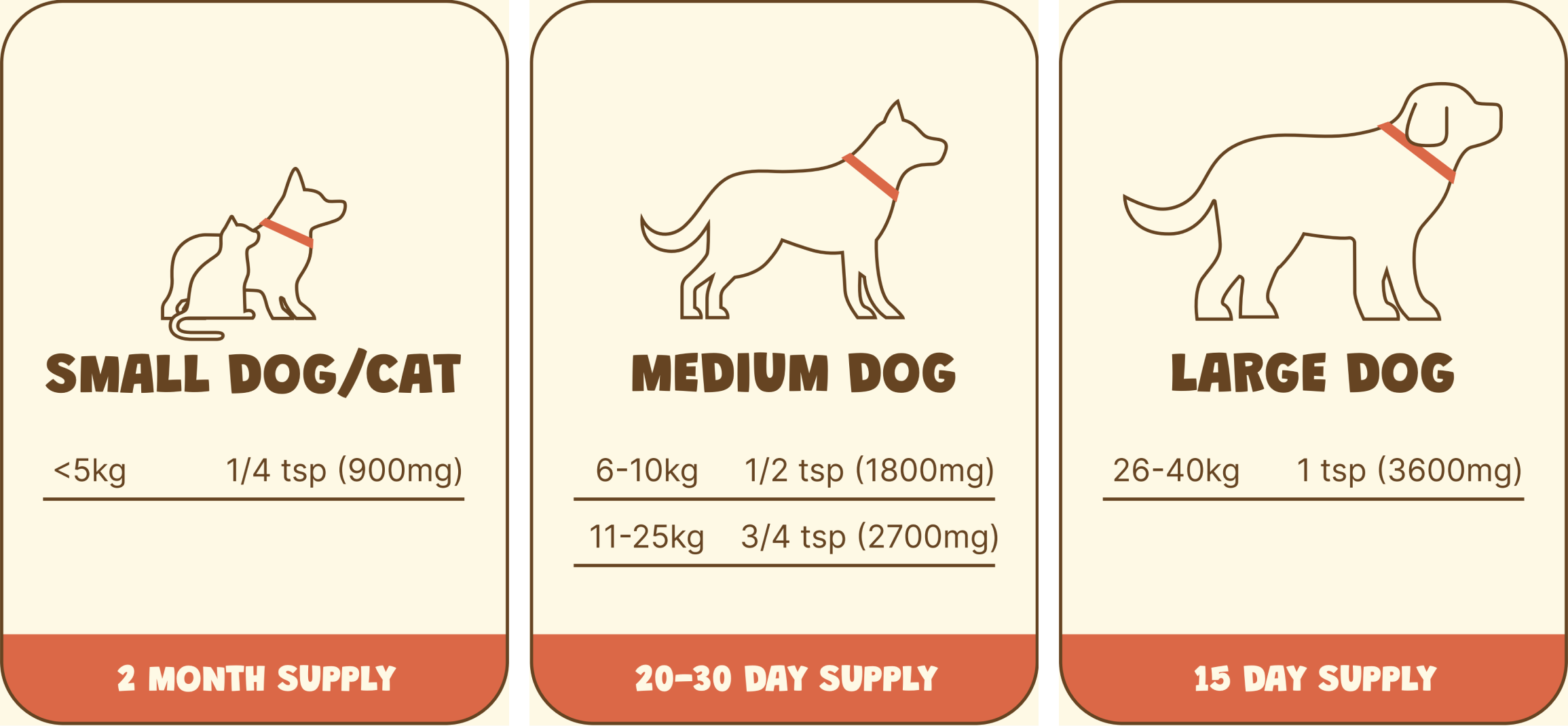 Using a standard teaspoon, measure the appropriate amount of powder based on your dog or cat’s weight.