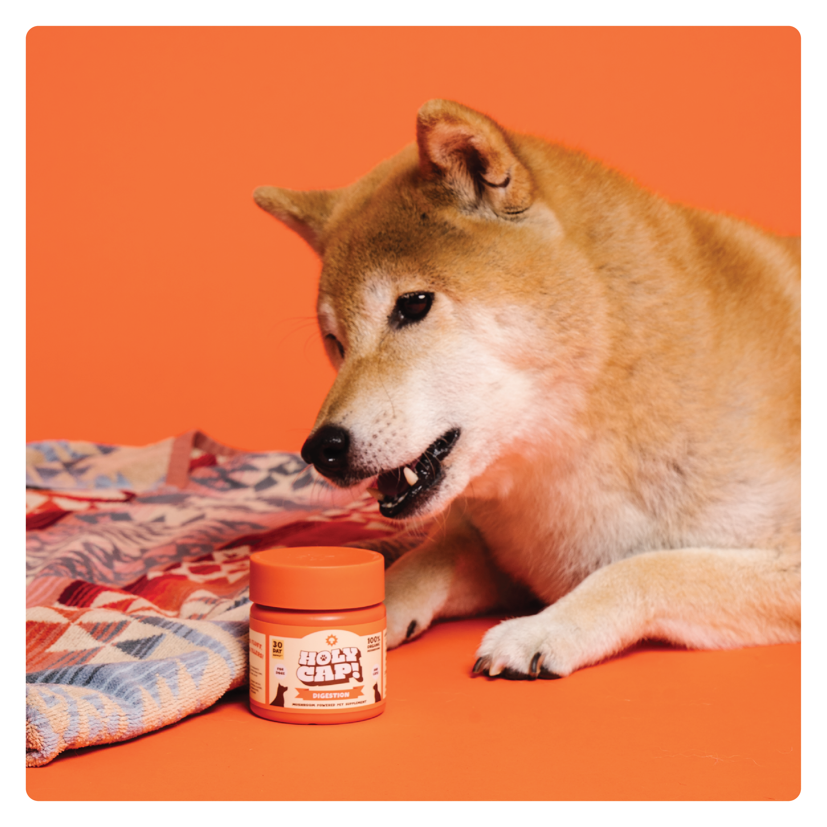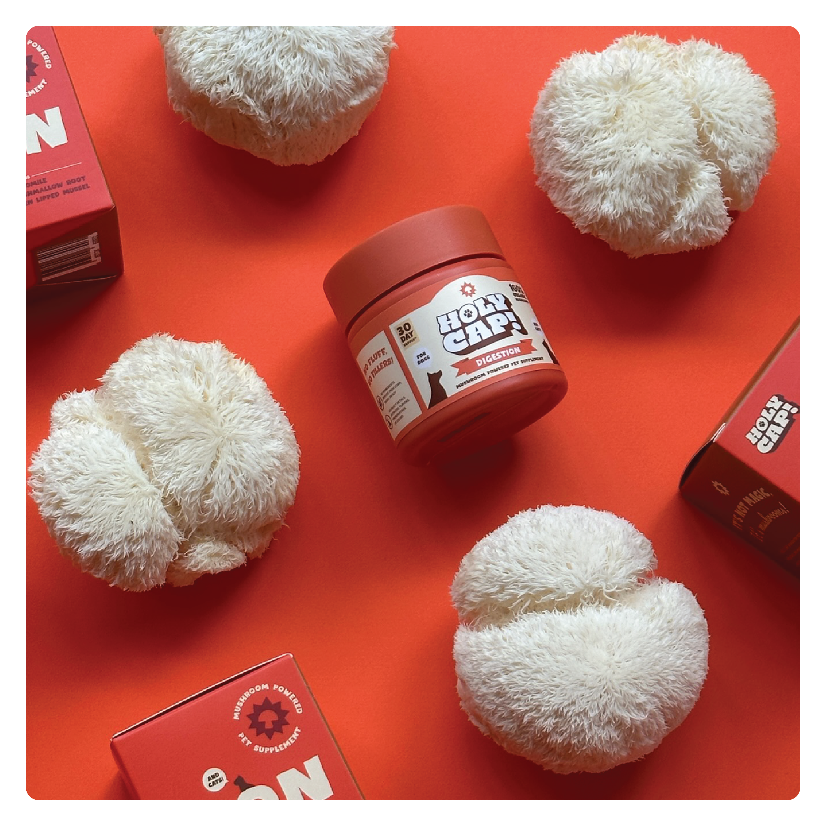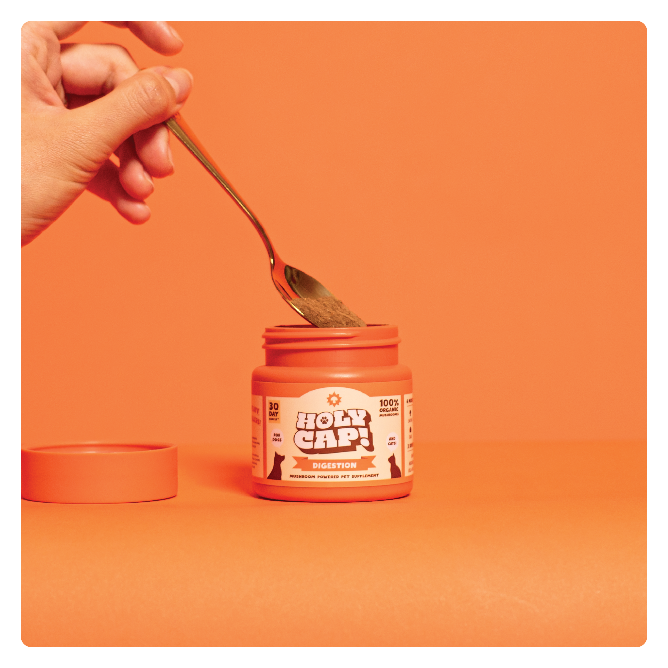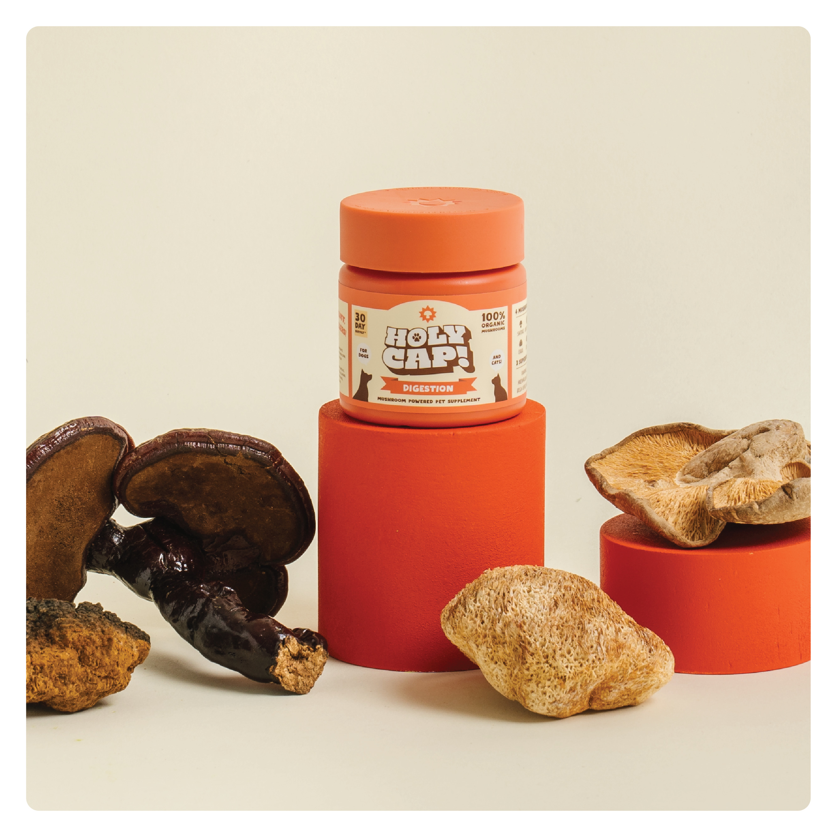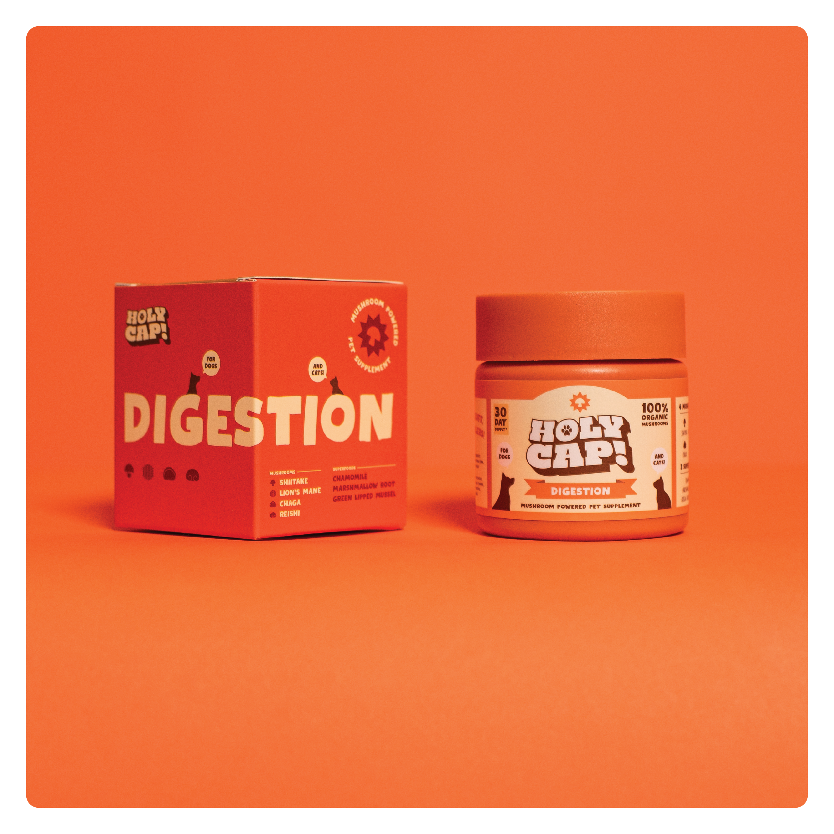 Our formula contains 4 of the most powerful Functional Mushrooms that support gut health and overall immunity, paired with 3 key superfoods that work synergistically to help soothe inflammation, support overall digestive health. Give your pet the best with our whole ingredients, no fluff, and no fillers approach. Sprinkle HOLY CAP Digestion formula on top of their meals and watch your pet glow!