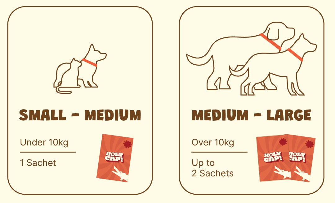 Some pets, especially those with underlying issues, can be sensitive to new additions to their diet. As a general rule, we suggest gradually adding our supplement to their daily meals and slowly increasing to the full dosage over 1-2 weeks. This will give their system time to adapt to the changes. If you have further questions about our feeding guide, please contact hello@holycap.shop and we will get back to you ASAP.