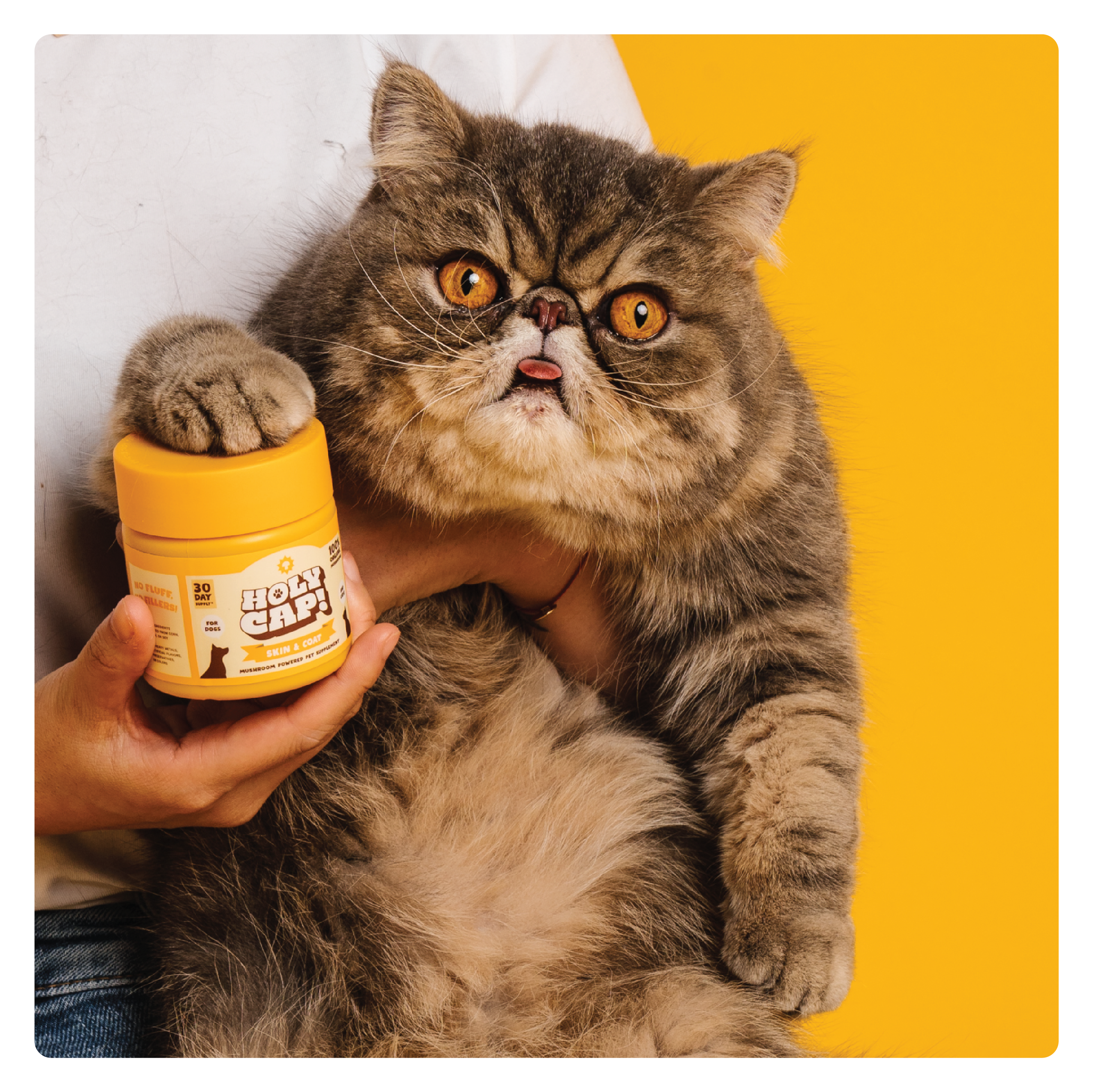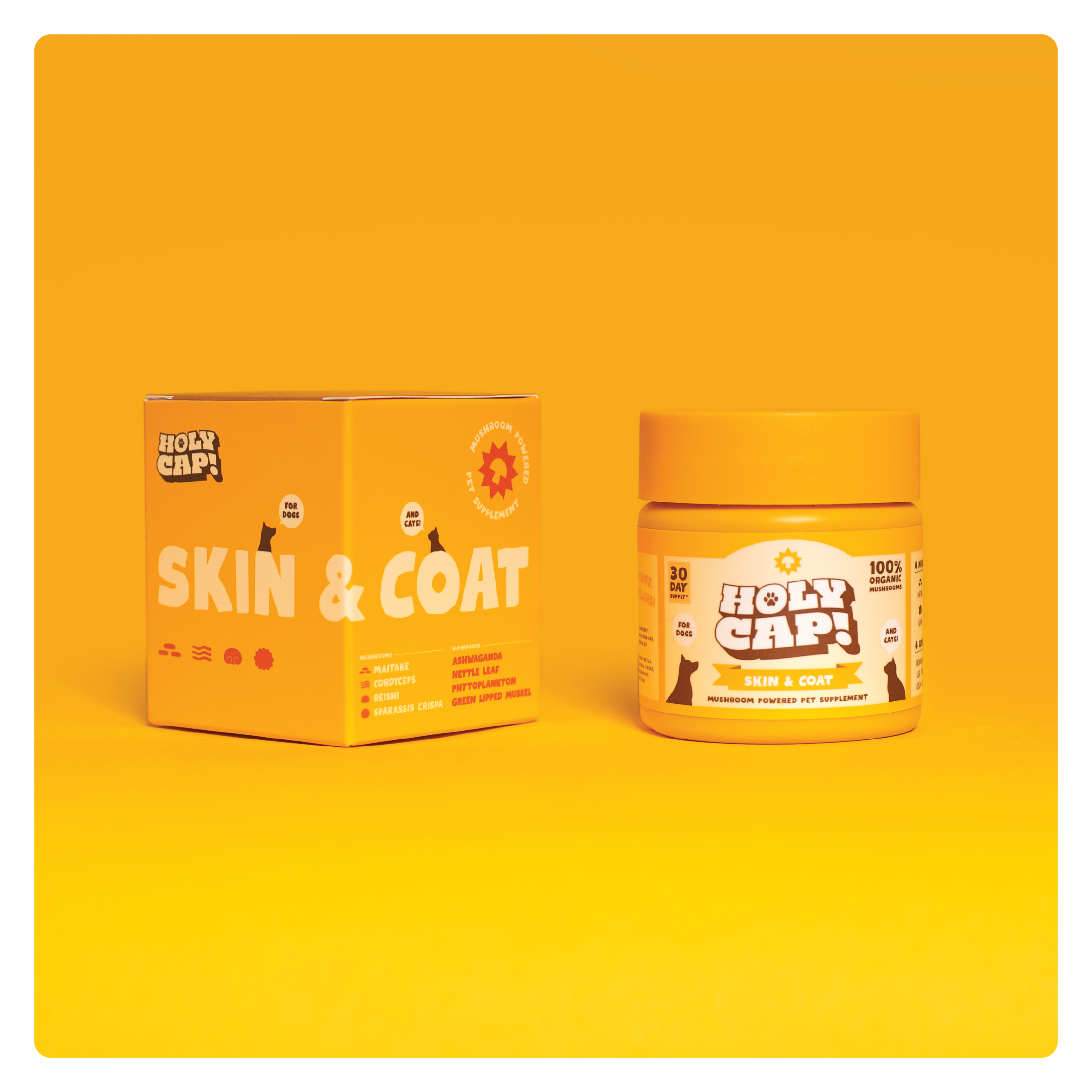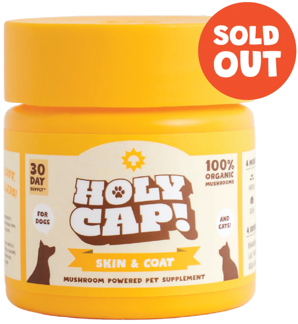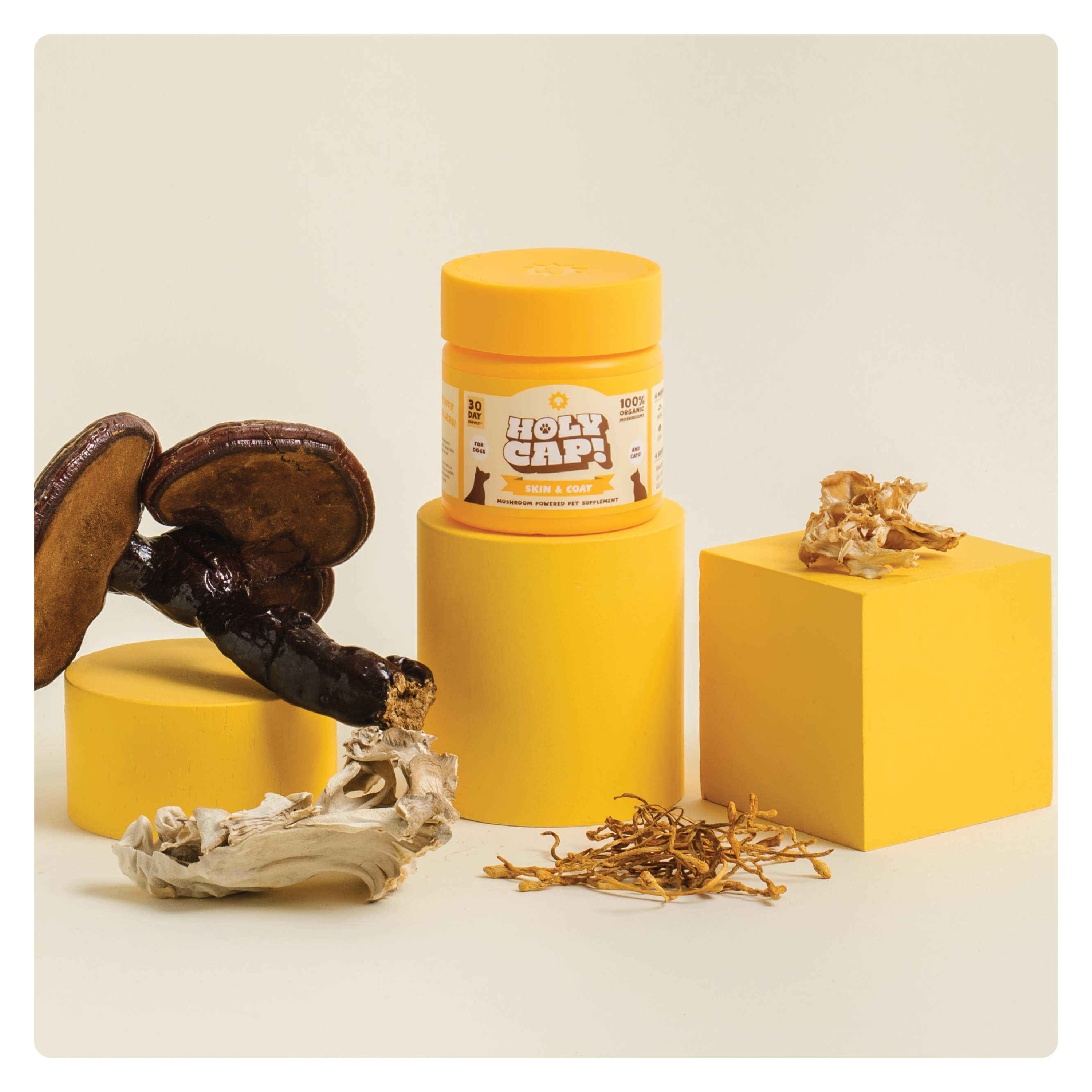Our formula contains 4 well-researched functional mushrooms that support skin, coat, and overall immunity, paired with 4 extraordinary superfoods to support the healing process of wounds, helps maintain skin allergies, and inflammation. With our whole ingredients, no fluff, no fillers approach, you can trust you are giving your pet the best of what Mother Nature has to offer. Sprinkle HOLY CAP Skin & Coat formula on top of their meals and watch your pet glow!